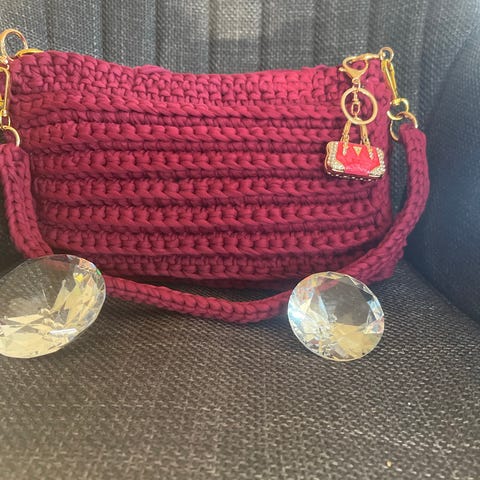 & Other Stories stoffveske for dame. Vesken er heklet/strikket i kraftig stoffmateriale i en rød /orange farge. Den har integrerte håndtak øverst og et åpent hovedrom uten inndelinger. På utsiden er det festet en avtagbar nøkkelring/anheng med hjerteformet dekor og perledetaljer i metallfeste. Passer som liten håndveske eller clutch til hverdagsbruk eller enklere anledninger der man trenger plass til mindre eiendeler som mobil, nøkler og lommebok.