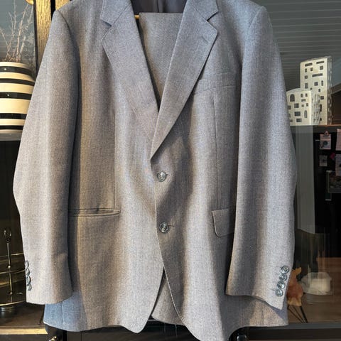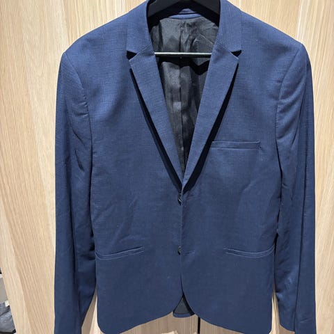 Skreddersydd dressjakke/ blazer. Tilhørende slips. Mål tilsvarer størrelse 48. Usikker på materiale, fremstår som ullaktig stoff. Klassisk modell med slag, to knapper i front og lommer. Dressjakke: Lengde rygg 73 cm. Bredde skulder- skulder 54 cm. Lengde armer 62 cm.