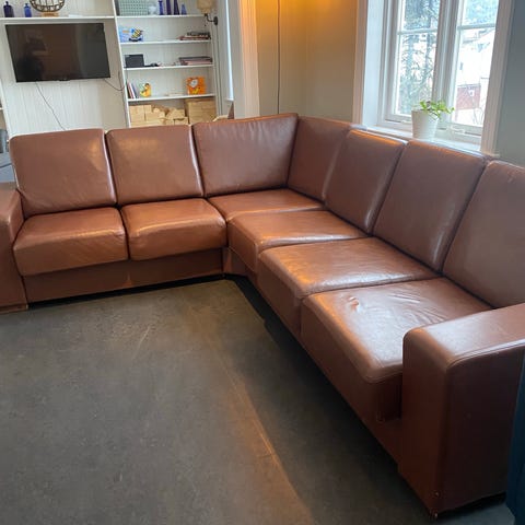 Sofa med sjeselong gis bort til første bud, mot henting. Den er 286cm bred og 86dyp, sjeselongen er 176cm dyp.