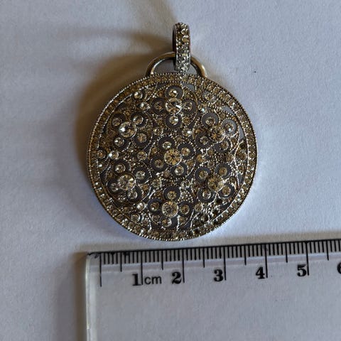 Dyrberg/Kern anheng for dame i sølv med krystaller. Baksiden har inngravert teksten «Celebrating Twenty Years of Jewellery Love» samt små innfelte krystaller. Anhenget har en rund hempe øverst for feste i kjede.