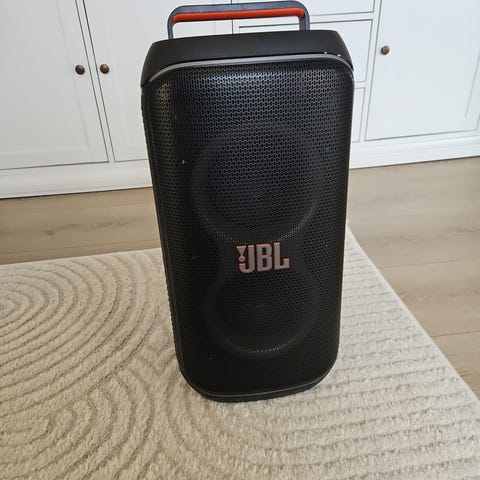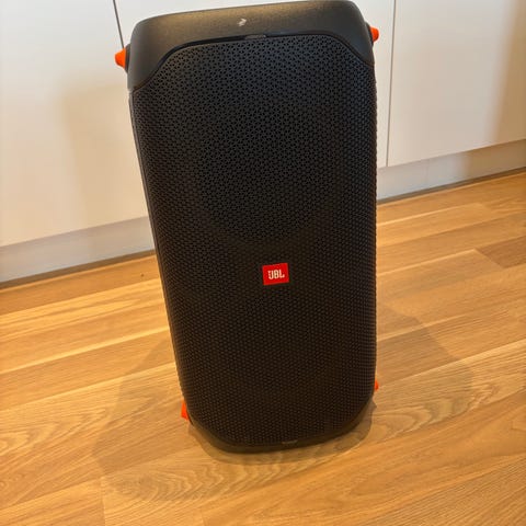 JBL PartyBox 110 trådløs høyttaler i svart. Bærbar festhøyttaler med integrert håndtak på toppen for enkel transport. Høyttaleren har LED-lys i front som kan lyse i ulike mønstre. På toppen finnes enkle knapper for blant annet strøm, Bluetooth og lysstyring. På baksiden er det tilkoblinger for AUX inn og ut, USB-port samt justering av gain. Egnet for trådløs musikkavspilling via Bluetooth og kablede lydkilder via AUX.