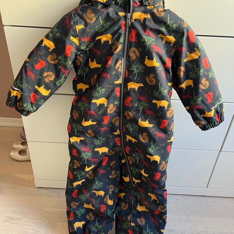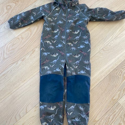 Pent brukt Name it parkdress/softshell størrelse 98. Dressen er grønn med dinosaurmønster og har fleecefôr på innsiden. Strikk under føttene og strikk nederst på ben og ermer bidrar til at dressen sitter godt.