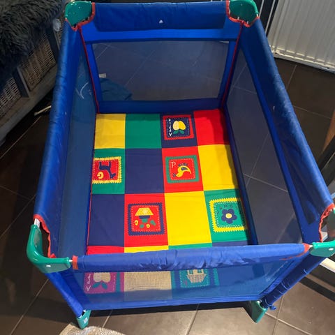 Kinderkraft reiseseng for barn i svart. Innvendig lengde 118 cm. Sengen har nettingpaneler på sidene som gir innsyn og lufting. Den kan slås sammen, noe som gjør den egnet til bruk på reise eller som ekstra seng. Egnet for små barn som trenger en trygg soveplass utenfor hjemmet eller som midlertidig seng i hjemmet. Madrass kan medfølge. Oppbevaringsbagen er dessverre ødelagt.