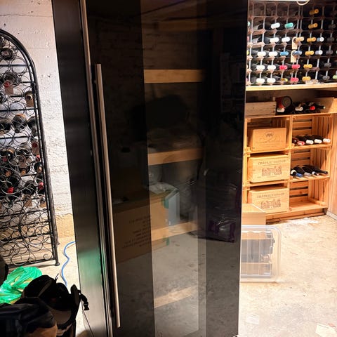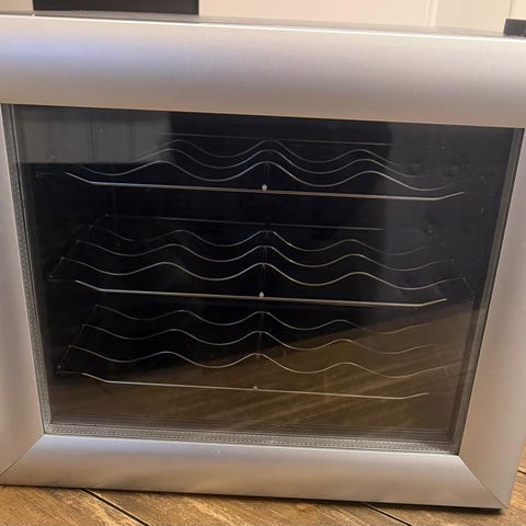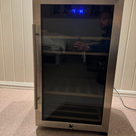 Frittstående vinskap med glassdør og innvendig blå LED-belysning. Skapet har flere uttrekkbare trehyller som gir plass til oppbevaring av vinflasker i liggende posisjon. Digital temperaturvisning er plassert i front, og temperaturen kan justeres elektronisk. Egnet for innendørs bruk til temperering og lagring av vin i husholdning eller hobbyrom. Kjøler ikke, usikker på hva som er galt.