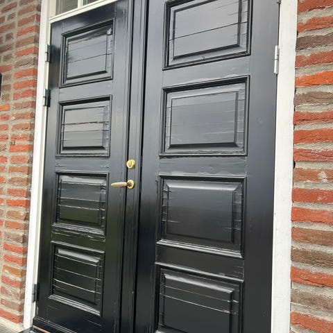 Dobbel ytterdør i tre med klassisk fyllingsdesign. Ca 20 år gammel. Noen bruksmerker. Med litt puss, sparkel og ny maling blir den som ny.