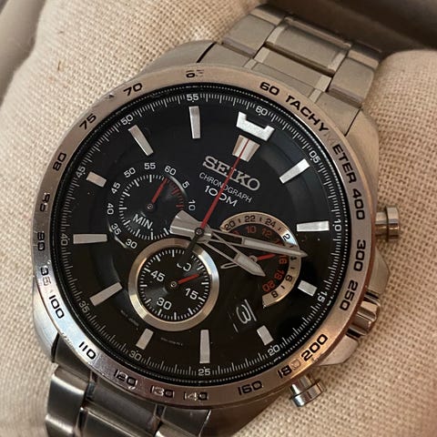 Lite brukt Seiko chronograph med kvittering, bevis og eske vurderes solgt.
