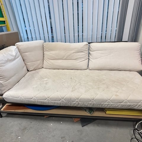 Hjemmesnekret benk. To store kjøkkenskuffer fra IKEA med pålimt front. Front i 9 mm bjørkefinér. Madrass medfører ikke.