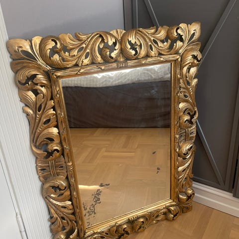 Nydelig gammelt speil med meget vakker ornamentert ramme i gull og svart. Str 56x66 cm. I utmerket stand.