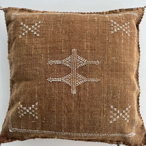 Vakkert berberputetrekk i slitesterk agavesilke, kjøpt i Marrakech. Ca. 50 x 50 cm. Hvert putetrekk er unikt, så målene varierer noe. Håndvevd kelim, med naturlige fargepigmenter fra planter og mineraler. Stoffene har deretter blitt vasket og bleket i solen. Glidelås i siden og ensfarvet bakside.