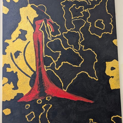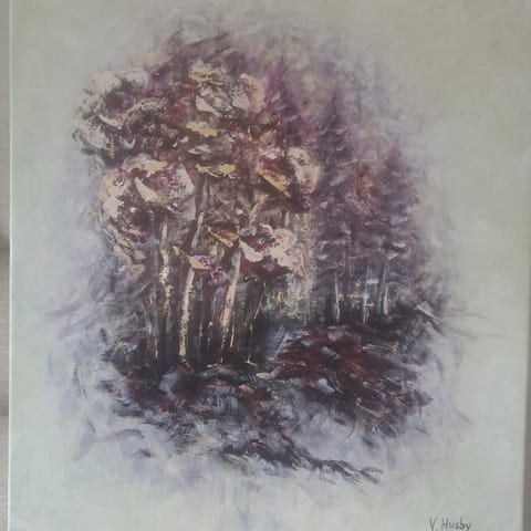 Maleri av et landskap med dam og trær i sterke, flerfargede toner. Motivet viser en dam i forgrunnen med trær og vegetasjon langs elvebredden, samt fargerike busker og trær i bakgrunnen. Bildet er utført i en ekspressiv stil med tydelige penselstrøk og varierte farger. Passer som veggdekorasjon i stue, gang, kontor eller andre oppholdsrom. Nærmere informasjon om teknikk akryl på lerret malt med pensel 50x60 cm.