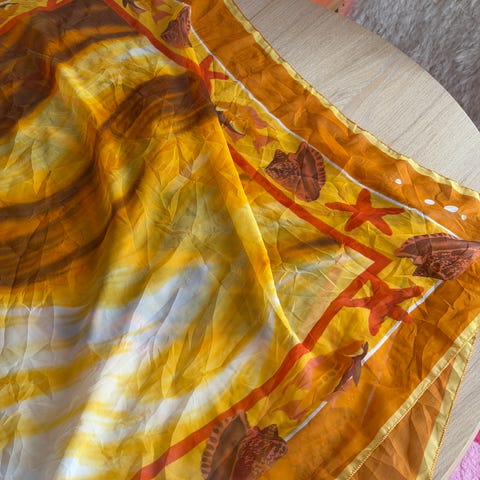 Veldig fint sommerlig skjerf med delvis gjennomsiktige stripper, laget av lett og glatt stoff som ikke klør. Egner seg godt som sjal over skuldrene til selskapskjole, skjerf rundt halsen, bikiniskjørt, cover-up over hoftene og mye mer. Kan styles på mange kreative måter!
