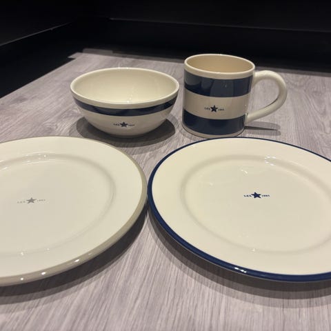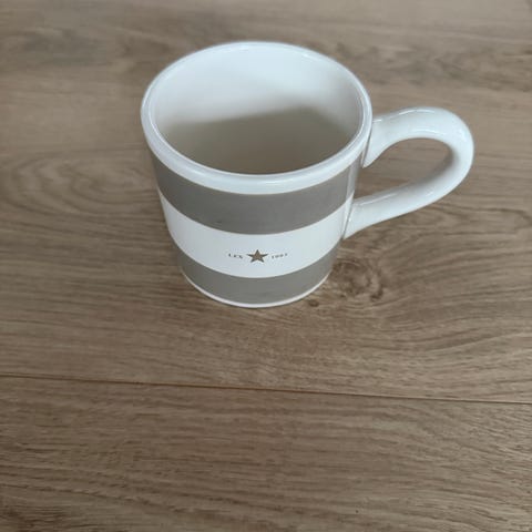 3 Lexington krus i keramikk med brede horisontale striper i beige og hvit til salgs 150 kr pr stk.Krusene har hank og dekor med stjerne og Lexington-logo. Egner seg til varme og kalde drikker som kaffe, te eller kakao, og passer godt i en serviseserie i lignende farger og stil.