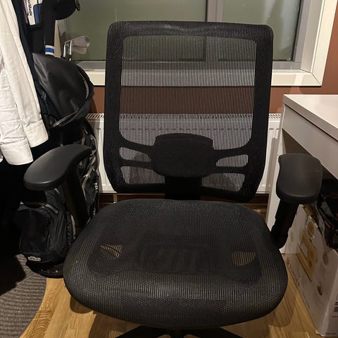 Trekket er i svart kunstskinn, og stolen er utformet som en kontor- eller datastol med ergonomisk preget rygg. På baksiden av ryggen er det synlige merker/slitasje i trekket, som bør tas i betraktning ved vurdering av stolen.