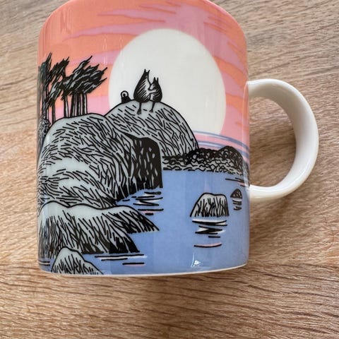 Arabia Mummikopp 3dl «Mummidalen» produsert i 2017 med etiketter selges.