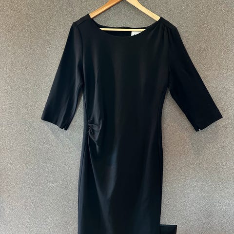 Gerry Weber hverdagskjole for dame i størrelse XL. Kjolen er svart og laget i polyester. Modellen har lange ermer og knutedetalj foran som gir en lett drapert effekt. Lengden går omtrent til under kneet, avhengig av høyde. Passer som enkel hverdagskjole eller til mer formelle anledninger med tilbehør.