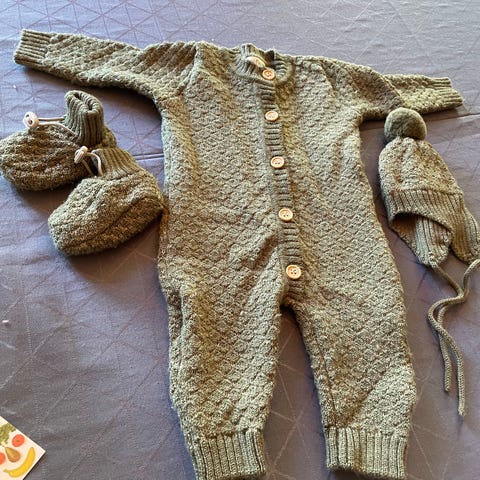 Reflex babysett i merinoull for unisex barn i størrelse 62. Settet består av en grønn heldress med knapper foran, samt matchende lue, votter og tøfler. Sendes mot vipps og frakt.