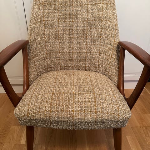 Treverket er nylig pusset og lakkert og har en dyp og fin brunfarge, ganske sikker på at dette er heltre. Nylig trukket om med solid stoff i nydelig grønnfarge, håndsydd, se bilder for detaljer. Noe bevegelse i ryggen når man setter seg på den, men er stabil og trygg.