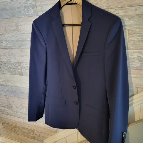 Bukse str.29/32 og jakke 44 regular slim fit. Brukt to ganger og er renset. Materialet er polyester/ull/lycra.