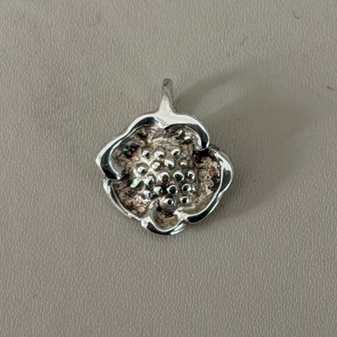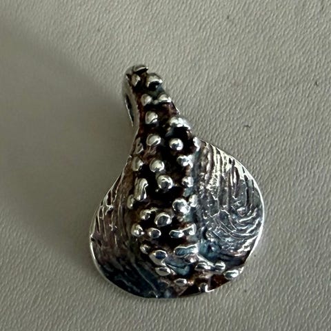Anhenget er ca 3x2 cm stort. Sølvkjedet er ca 38 cm i omkrets.