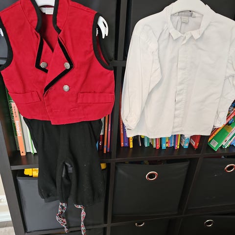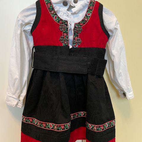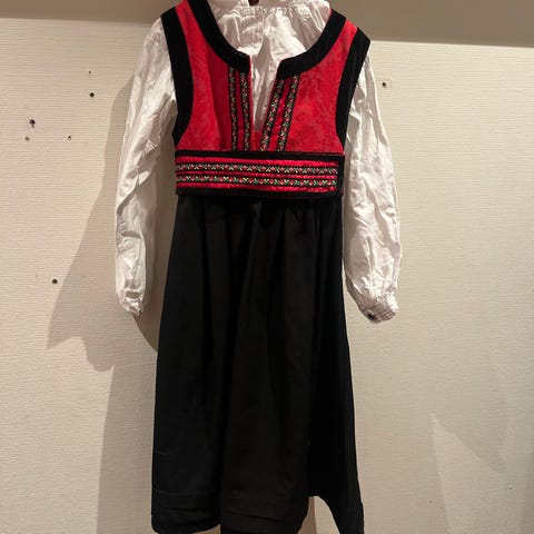 Kjempefin bunad med romslig skjortebody. Brukt 1 gang til 1 barn. Kjøpt ny. God i størrelsen. Ingen anmerkninger.