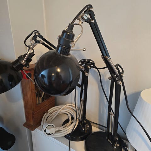 Bordlampe i svart metall med justerbar arm og rund fot. Lampen har leddet konstruksjon som gjør det mulig å regulere høyde og vinkel på skjermen. Egnet som skrivebordslampe eller arbeidslampe på kontor eller i hjemmemiljø. Bruker standard lyspære