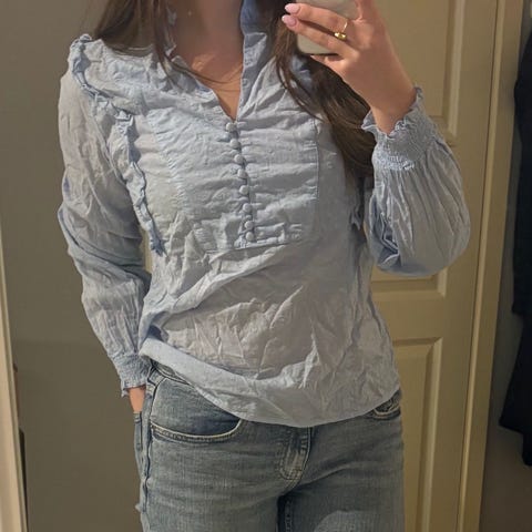 Floyd bluse for dame i størrelse XL. Blusen er rosa og laget av 100 % bomull. Modellen har lange ermer med strikk nederst og dekorative innfelte detaljer på bryst og ermer. V-utringning med liten ståkrage. Passer til hverdagsbruk og kan kombineres med både bukser og skjørt. Knapt nok brukt , er ikke strøket etter vask.