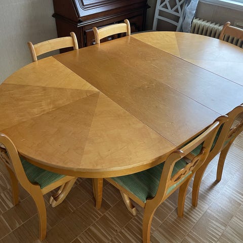 En elegant gustaviansk spisegruppe bestående av spisebord og 6 stoler.