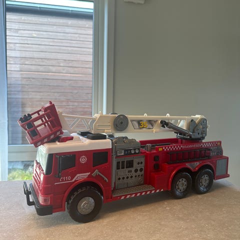 Lekebil brannbil og lekekran. Brannbilen er rød med uttrekkbar stige og flere detaljer som etterligner en ekte brannbil. Lasteplanet har ulike rom og markeringer. Leken passer til barn som liker utrykningskjøretøy og rollelek. 200 kr