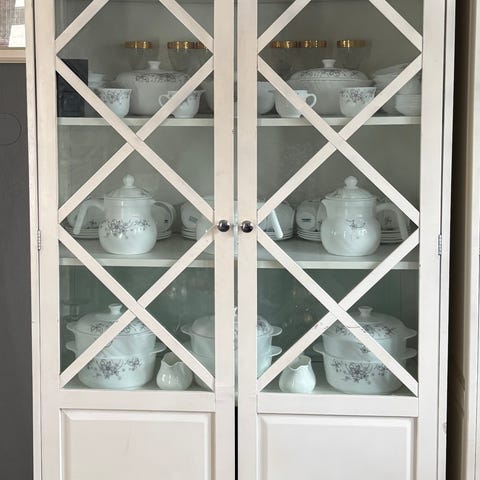 Selger dette fine vitrineskapet fra IKEA. Det er glasshyller i øvre del og tre i resten. Håndtakene er byttet til grønn marmor, disse følger med ved kjøp. Mål og pris for nytt skap på bilde 2