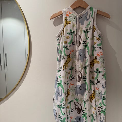 Toveis glidelås på den ene siden, lett med bleieskift på natta. Trykknapper på skuldrene, samt en ekstra knapp i hvert armhull for å stramme den mer inn ved behov.