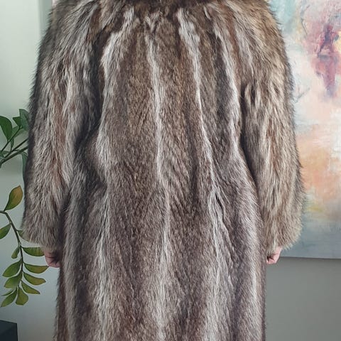 Lang fin og varm pels. Litt revnet øverst i stoffet, kan sys. Ellers ingen feil/mangler. Tre trykknapper og en på ved halsen slik at den varmer godt. Kjøpt på Pelsnordic As i Oslo for mange år siden, hengt kaldt i et dynetrekk i mange år.