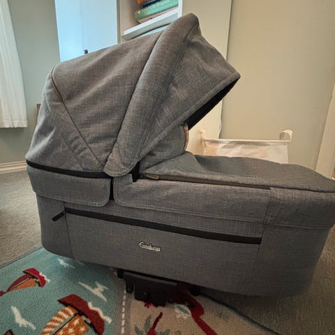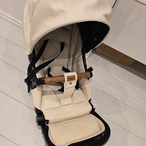 Sittedelen er helt ny og bare prøvd en gang. Den er kjøpt sommeren 2025, men har vært nedpakket til nå på grunn av at baby har vært for liten. Jeg har nå kjøpt en annen sittedel og har derfor ikke behov for denne.