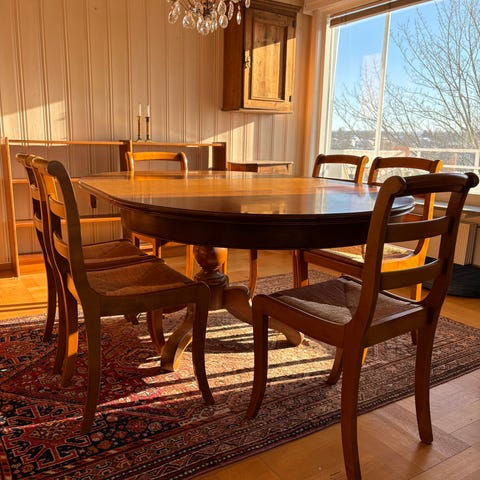 Brukt Mahogny spisebord med 6 stoler tilsalgs. Merker på bordplate. Lengde ca 145cm . Bredde 108 cm. Klaffer 50 cm , 2 stk. Bord totalt 245 cm.Kr 1000. Må hentast Bryne.