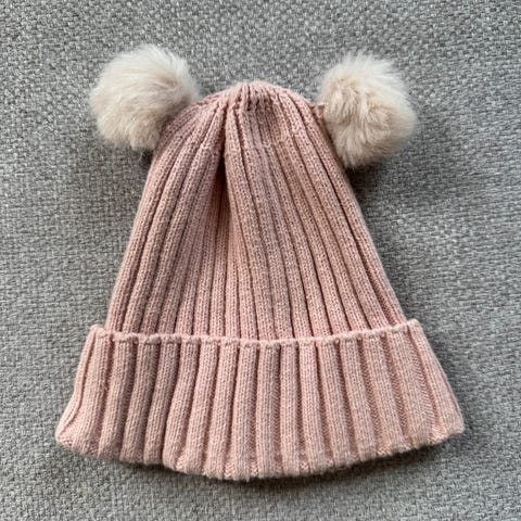 Lue med store dusker størrelse 4-8 år, liten i størrelsen. Hals one size. 50 % viscose. Som nytt.