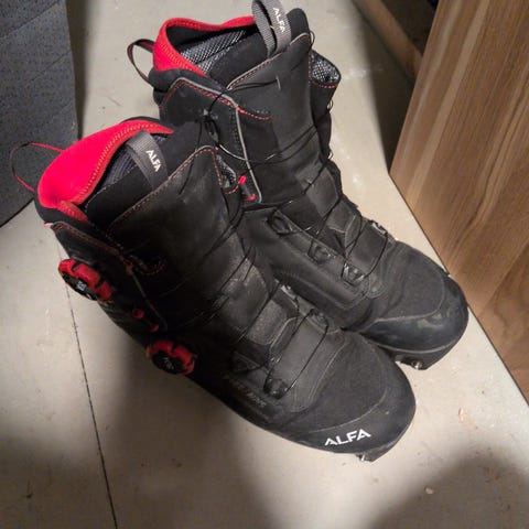 Alfa Skaget Perform W fjellskistøvler for dame i størrelse 38. Støvlene er svarte med røde detaljer og har kraftig yttersåle med grovt mønster for godt feste. Modellen er beregnet for fjell- og toppturbruk på ski. Overdelen er laget i slitesterkt materiale med snøring og hemper som gir god justering rundt fot og ankel. Innvendig merking viser EU 38 / US 7,5 / UK 5. Egner seg til turer i variert terreng der det er behov for stabile og varme fjellskistøvler.