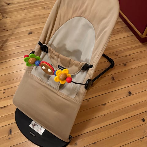 BabyBjörn Bliss vippestol i svart og grått. Setetrekket er avtagbart og kan vaskes. Vippestolen leveres med leke bøyle med fargerike figurer.