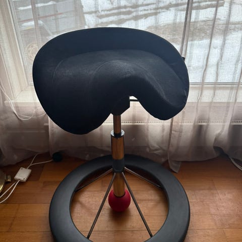 Pent brukt ergonomisk balansestol med ulltrekk.