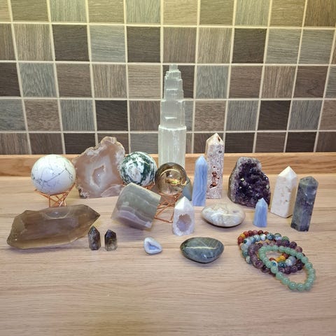 Selger en fargerik og variert samling av små krystallfigurer og polerte steiner. Perfekt for deg som lager smykker, driver med krystall-grids, eller bare vil ha litt magisk dekor i hjemmet.