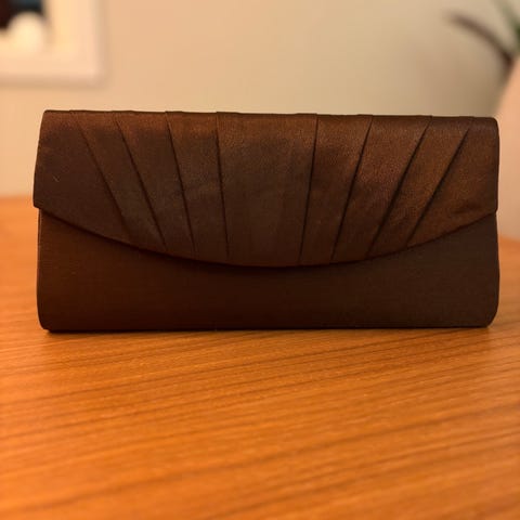 clutchveske for dame i svart stoff. Vesken har rektangulær fasong og klaff med stor sløyfedetalj foran. Lukkes med trykknapp. Innvendig har den et hovedrom og en mindre lomme som passer til småting som kort, nøkler eller leppepomade. Egnet som enkel selskaps- eller festveske der man kun trenger å ha med det mest nødvendige.