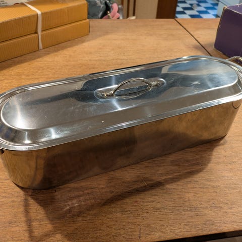 Helt ny fiskekjele selges. Fått i gave, men aldri blitt brukt. Mål ca 45 cm x 15 cm x 11 cm høy. Praktisk til både fisk og pinnekjøtt bla.