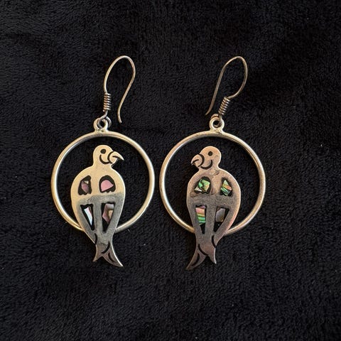 Lang, "fugl med blad "- motiv. Høyde: ca 9 cm. På det bredeste: ca. 3 cm.