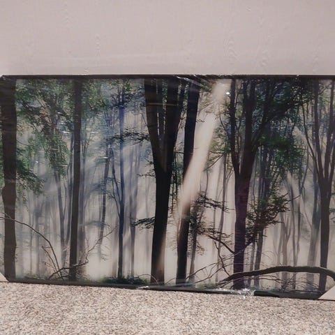 Bohus bilde skogmotiv rektangulær veggdekor. Bildet viser en tett skog med trær og lys som skinner gjennom, i grønne og naturfargede toner. Rektangulært format med smal, mørk ramme. Egnet som veggdekor i stue, soverom, gang eller kontor. Kan henges horisontalt på vegg med egnet opphengssystem.