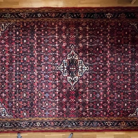 Bergama teppe i størrelse 170 x 240 cm med klassisk orientalsk mønster i hovedsakelig rosa og beige toner med mørke kontrastfarger i bord og detaljer. Produsert i ren ny ull (pure new wool)