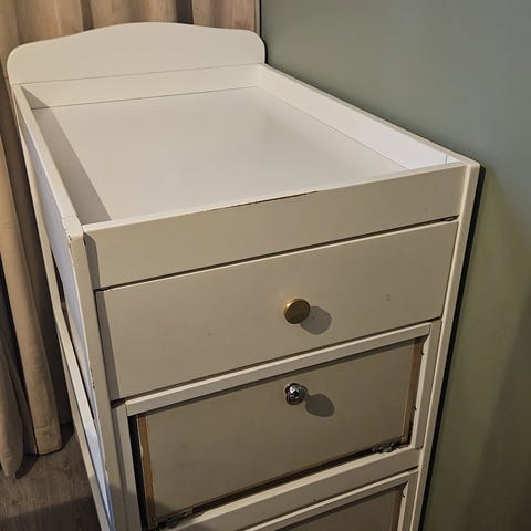 Praktisk og romslig stellebord i hvit utførelse selges. God oppbevaringsplass til klær, håndklær, bleier og alt annet en baby trenger.
