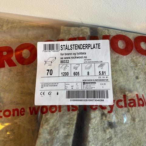 10 pakker (58m2)Rockwool Stålstenderplate isolasjon 70 mm 605x1200