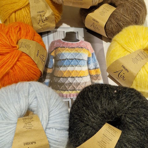 Selger oppskrift på stripegenser fra bystrikk. Garn fnugg in florence. Et nøste koster orginalt 129,- det ene av de grå nøstene er rekket opp men like fint å strikke av.