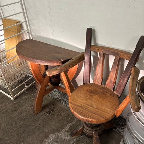 Bordet har dreid søylefot og kryssformet fot med fire ben, fine detaljer Passer som sidebord, lampebord eller lite avlastningsbord i stue, gang eller soverom. Undersiden viser massiv trekonstruksjon med skrudd feste mellom bordplate og understell.