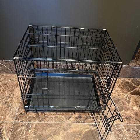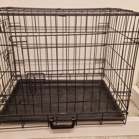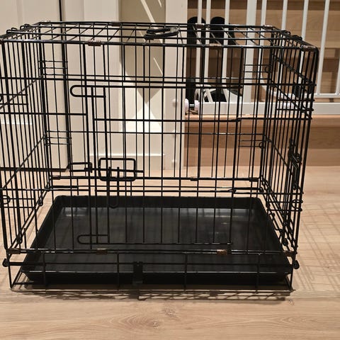 Zoozaker sammenleggbart hundebur i svart metall. Buret har gitterkonstruksjon med låsbare dører og uttakbar bunn i plast for enklere rengjøring. Egnet som innendørs hvile- og oppholdsplass for hund. Metallrammen kan slås sammen for lagring eller transport når buret ikke er i bruk. Det er synlige rustpartier på enkelte metallpunkter og en liten bøy på sidedør, se bilder for detaljtilstand.