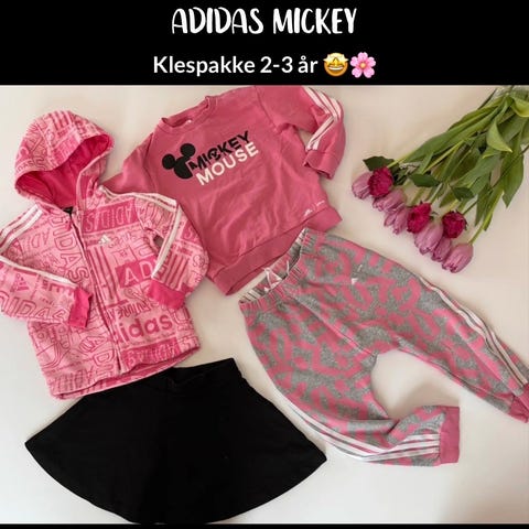 Pakken består av en flerfarget genser med Adidas-logo på brystet(str 104 men liten i strørrelsen) og to joggebukser i ulike rosatoner og én svart med klassiske Adidas-striper og logo. Plaggene har ribbekanter og strikk i livet på buksene for god passform. Egnet som hverdags- og fritidstøy for barn i størrelse 92/98.