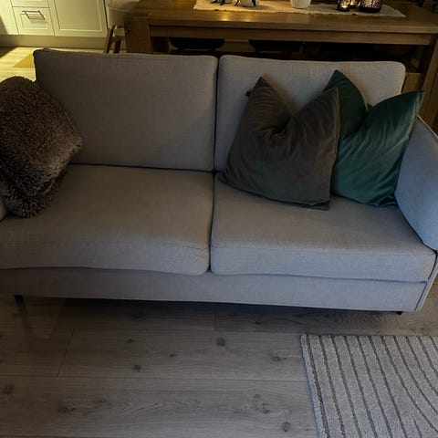 Grå sofa med stor sittekomfort. To løse sitteputer, to løse ryggputer og to løse endeputer. Alle putene kan brukes på begge sider. Stoffet er ikke påvirket av lys eller sol.